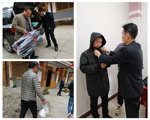 早上7:30分从公司总部出发,中午12点到达县城用过便饭之后,汪书记带上在饭馆为项目员工们现包的饺子,继续出县城前往13公里外的项目驻地。进入项目临时办公室,和大家一一打招呼,第一时间分发冬装请他们试穿,遮风挡雨的冬装穿在身上,一个个都很合身,心里也是暖暖的。汪书记、刘部长、鲁书记还逐一检查了员工宿舍和厨房,提醒用餐卫生、冬季用电安全,特别强调了煤气的危险性。