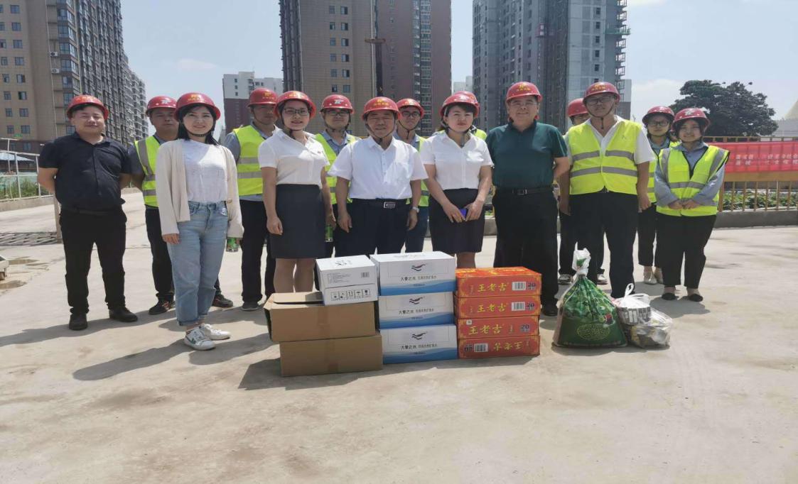 在项目施工现场,刘书记和一线员工一一握手,代表集团公司对大家在酷暑中坚守工作岗位表示感谢,并与集团宣传部长张斌、团委副书记杨文莉一同将饮料、绿豆等清凉解暑慰问品送到一线员工手中。