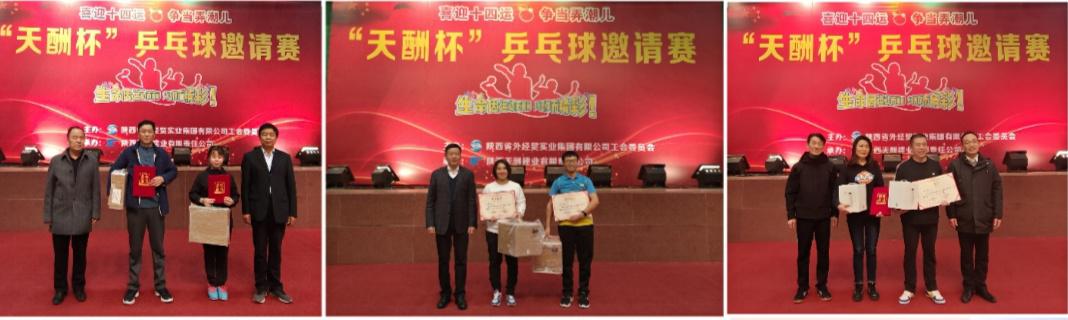 为丰富员工文体生活、促进企业交流共进、喜迎十四运,11月21日,由陕西省外经贸实业集团有限公司工会主办、陕西天酬建业有限责任公司工会承办的“天酬杯”乒乓球邀请赛于航空工业电源体育馆举行。集团公司党委书记、董事长肖玉龙,党委副书记、工会主席刘浩川,党委委员、天酬公司董事长丁永忠, 集团董事、深圳长安集团党委书记、董事长梁晓龙及基层各单位、集团相关部门负责人出席了活动。