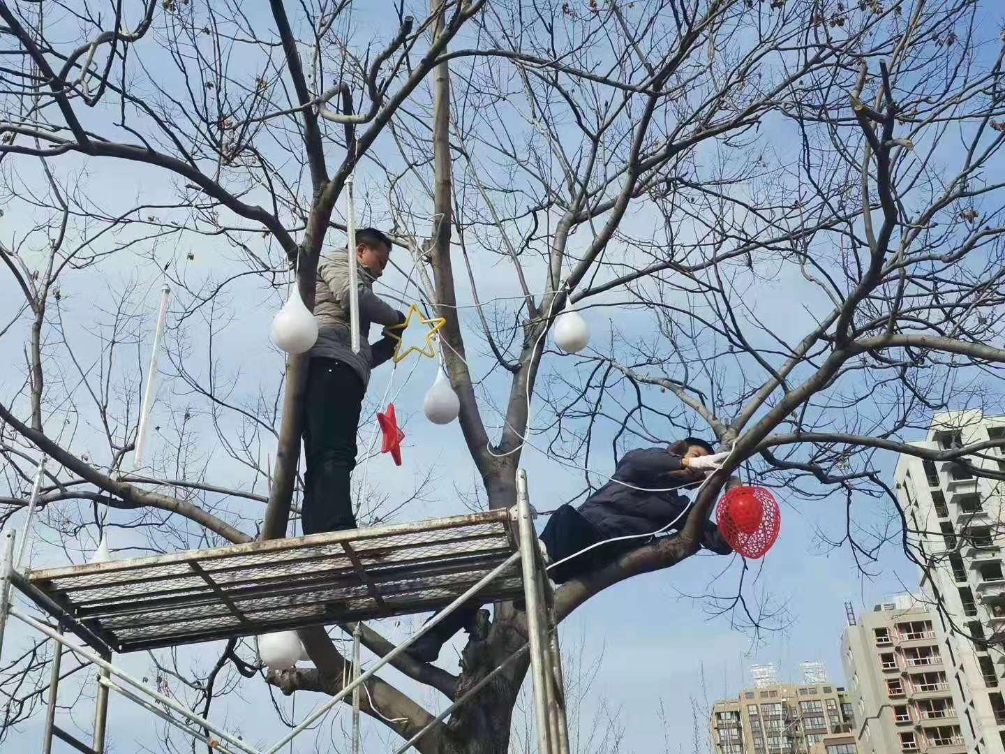 新春将至,为给广大业主营造一个喜庆祥和的节日氛围,1月27日上午,天酬房地产公司蒲城项目部全体员工在小区西门里沿主路两侧树枝上悬挂各式各样的彩灯,烘托点缀出张灯结彩、火树银花的节日景观。