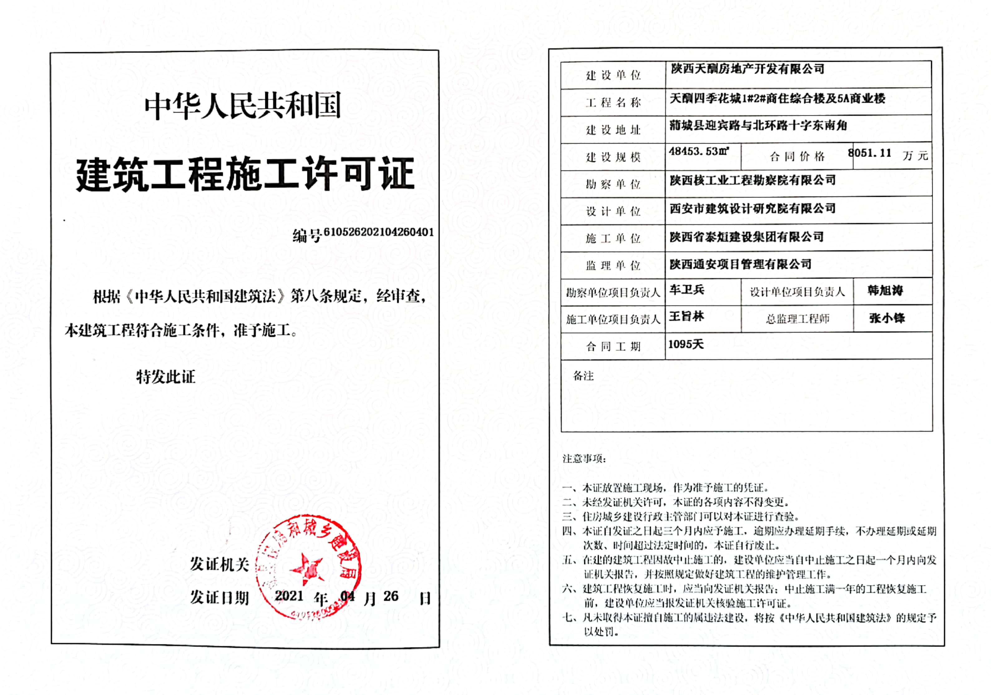2021年4月26日,蒲城四季花城商住综合楼项目成功取得《建筑工程施工许可证》,为推进施工进度及后期办理商品房预售许可证等提供了有利条件,标志着该项目即将进入施工建设阶段。