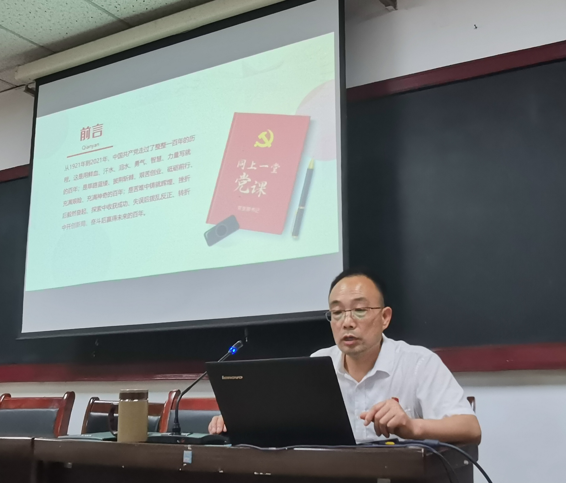 课上,李满星以《学习中国共产党百年辉煌史》为题,从党在新民主主义革命时期完成救国大业、党在社会主义革命和建设时期完成兴国大业、党在改革开放和社会主义现代化建设新时期推进富国大业、党在新时代推进并将在本世纪中叶实现强国大业、中国共产党百年历史总结五个部分,运用丰富的史料、生动的事例、详实的数据,并结合视频讲述了中国共产党从无到有、从弱到强的百年光辉历程,使大家看到了中国革命道路的曲折艰辛,感受到了党在关键时刻的力挽狂澜、不屈不挠的时代创举,学习了共产党人不畏牺牲、英勇奋斗的先进事迹。