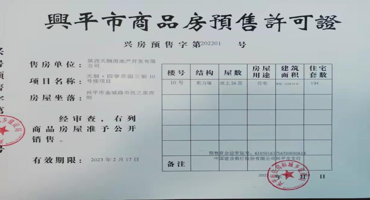 2022年2月18日,由陕西天酬房地产开发有限公司开发建设的天酬·四季花园三期10号楼取得预售许可证,标志着项目销售工作进入了一个全新阶段。