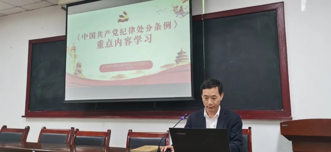 纪检委员王根利重点从《中国共产党纪律处分条例》的指导思想、原则和适用范围,违反“六大纪律”行为的处分等方面,对《条例》做了全面、深入的讲解。通过观看警示教育片,要求党员干部要深刻领会《条例》的精神实质,真正做到内化于心、外化于行,将《条例》精神融合到工作中、行动中;领导干部通过学习要明法纪、知敬畏、存戒惧、守底线,强化责任担当,带头维护党规党纪的严肃性和权威性。