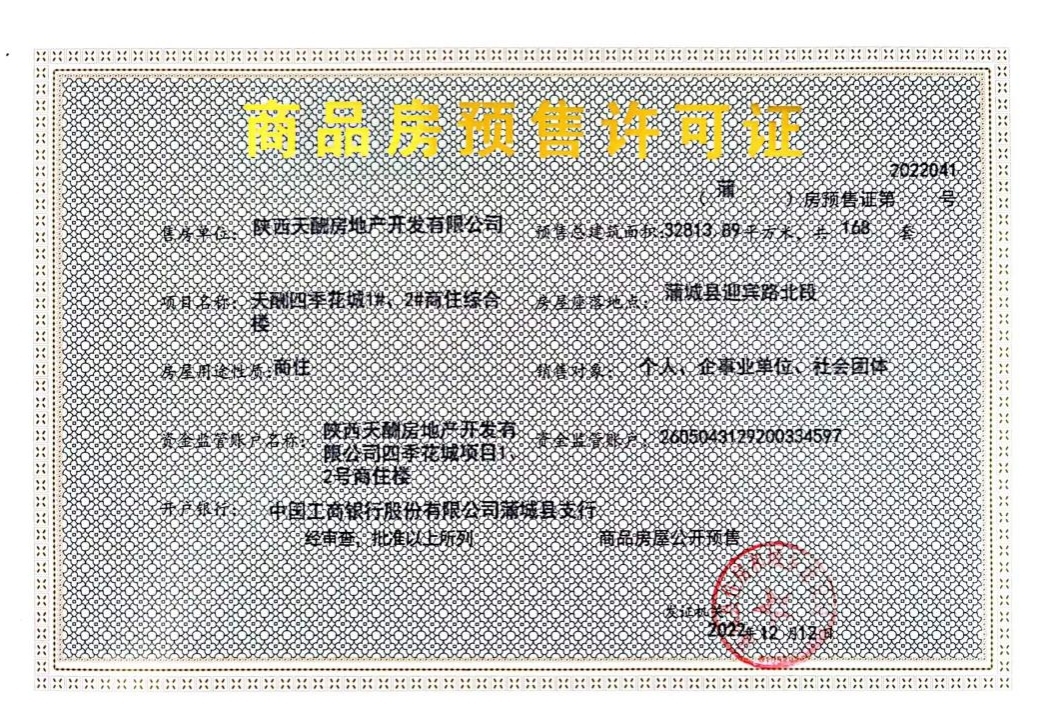 2022年12月12日,陕西天酬房地产开发有限公司蒲城项目部顺利取得1#、2#商住综合楼商品房预售许可证。