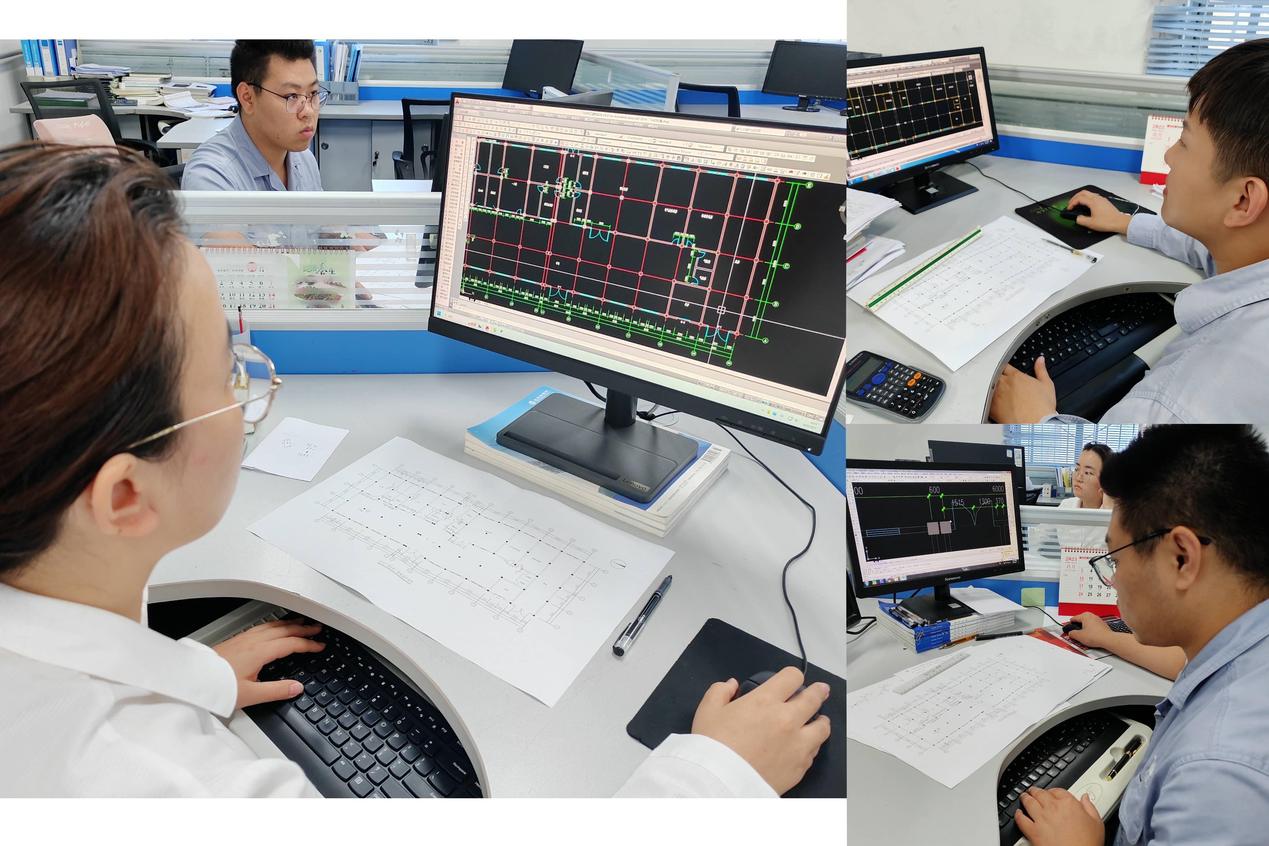 此次比赛面向设计公司内部,以某厂房改造平面图为题,参赛员工需在规定时间内运用CAD软件完整绘制。为提升难度,参考图纸均为纸质打印版,并对部分构件尺寸未做标注,需参赛员工使用比例尺在图纸上进行测量。比赛中,设计公司三名设计员认真细致、你追我赶,尽可能的使自己的图纸规范美观。赛后,技术室主任鲁维对选手们的CAD图纸进行打分,并逐一做出点评。