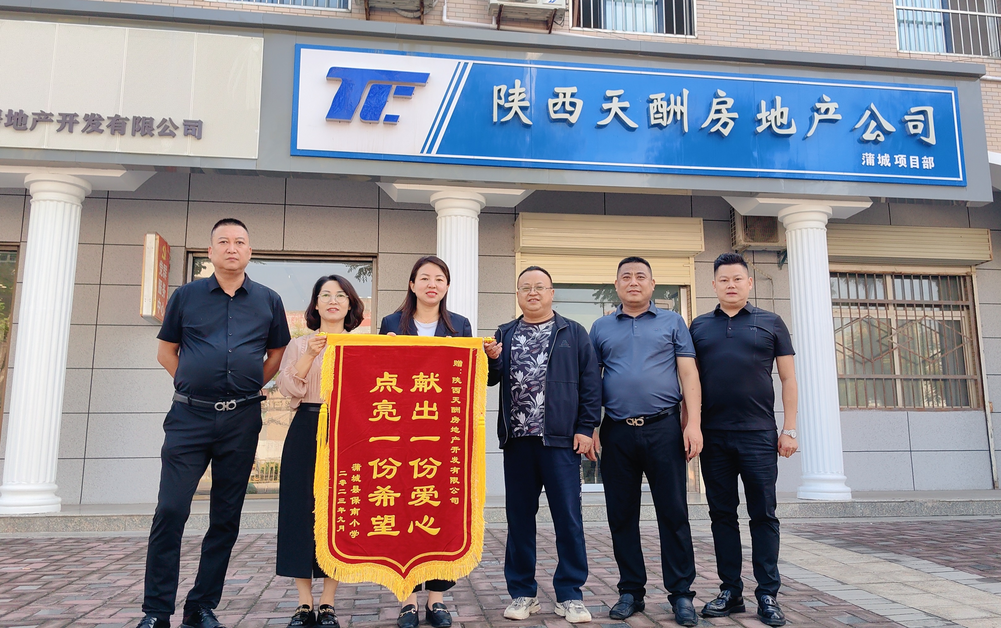 9月22日,蒲城县政协工商联委员、蒲城县保南小学校长一行将一面写有“献出一份爱心,点亮一份希望”的锦旗送到了陕外集团天酬建业公司所属房地产公司经理梁美霞手中。