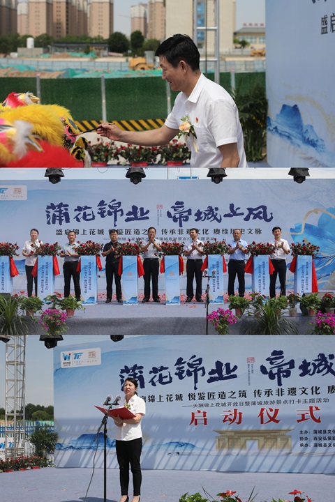 随后书法家协会会员吴双印向天酬公司赠送“蒲花锦业 帝城上风”书法作品。蒲城县文旅局副局长刘麦芳,天酬公司党支部副书记、总经理汪虹,共同手持朱砂笔,为庆典醒狮点睛。在现场嘉宾见证下,与会领导登台剪彩,艺术售楼部、匠艺景观区、美学样板间随之正式揭幕。