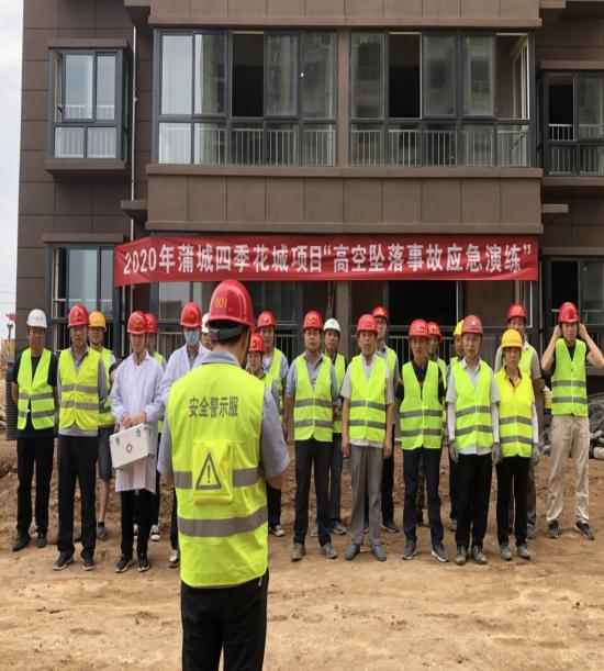 为贯彻落实2020年“安全生产月”活动精神和集团“安康杯”竞赛实施方案,2020年6月19日上午,蒲城四季花城项目部经理吴博组织陕西天酬路桥建筑工程有限责任公司蒲城四季花城项目部所有员工、陕西天酬房地产开发有限公司甲方代表、陕西通安项目管理有限公司监理人员及现场各专业分包劳务队伍,开展了高空坠落事故应急救援演练活动。