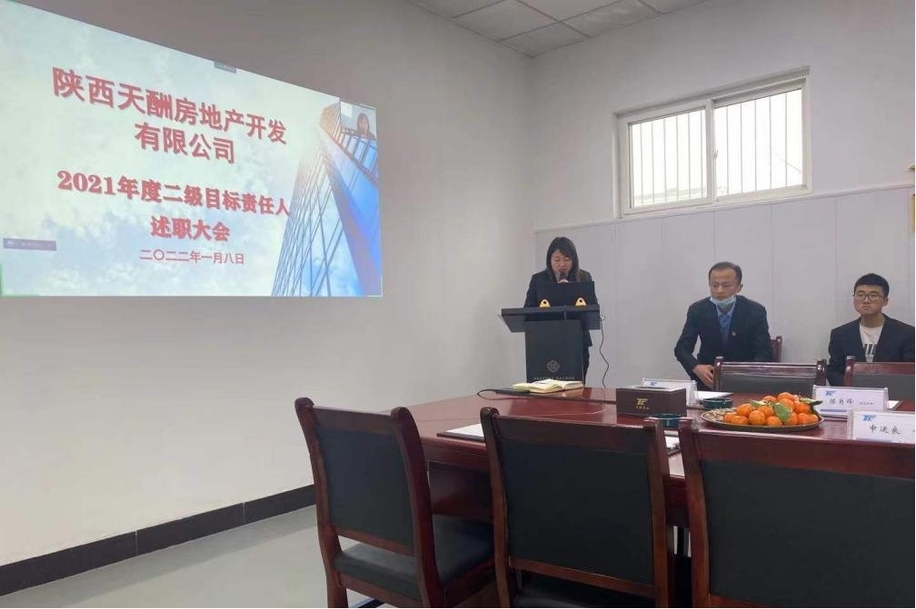 新年伊始,我们总结过去,展望未来。2022年1月8日下午,天酬房地产公司召开了2021年度二级目标责任人年终考核会。会议由房地产公司经理梁美霞主持,天酬公司党支部副书记、总经理汪虹,副总经理王根利、陈肖锋,各部门、各实体负责人,职工代表及各项目部员工参加了会议。