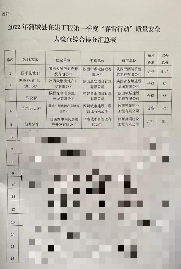 为推动蒲城县建筑工程质量、安全平稳有序发展,蒲城县住房和城乡建设局于2022年3月在全县组织开展了建筑工程第一季度“春雷行动”质量安全大检查活动。在本次检查中,由陕西天酬房地产开发有限公司开发,陕西天酬路桥建筑工程有限责任公司承建,陕西华睿诚咨询有限公司监理的“天酬四季花城5#楼项目”在本次评比中脱颖而出,排名第一。